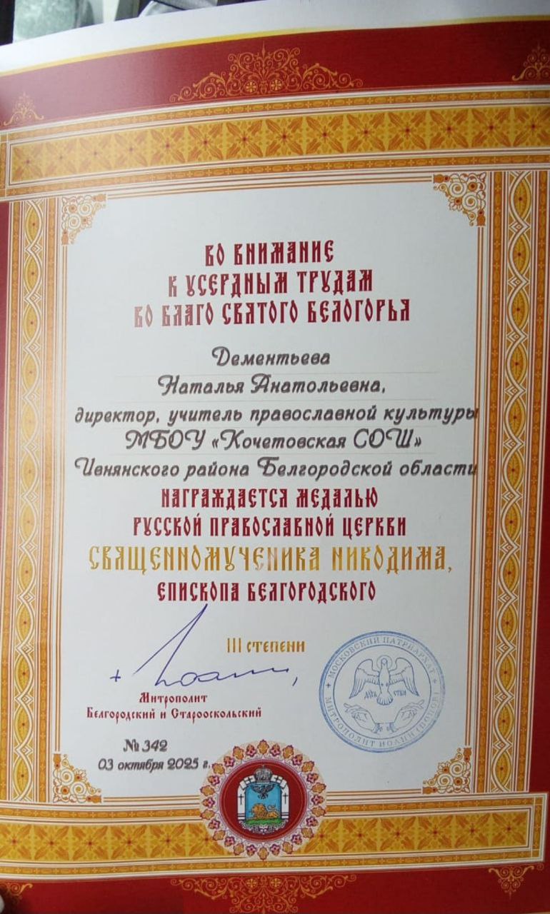 Среди награжденных особой награды была удостоена Наталья Анатольевна Дементьева — директор Кочетовской школы и преподаватель Православной культуры.